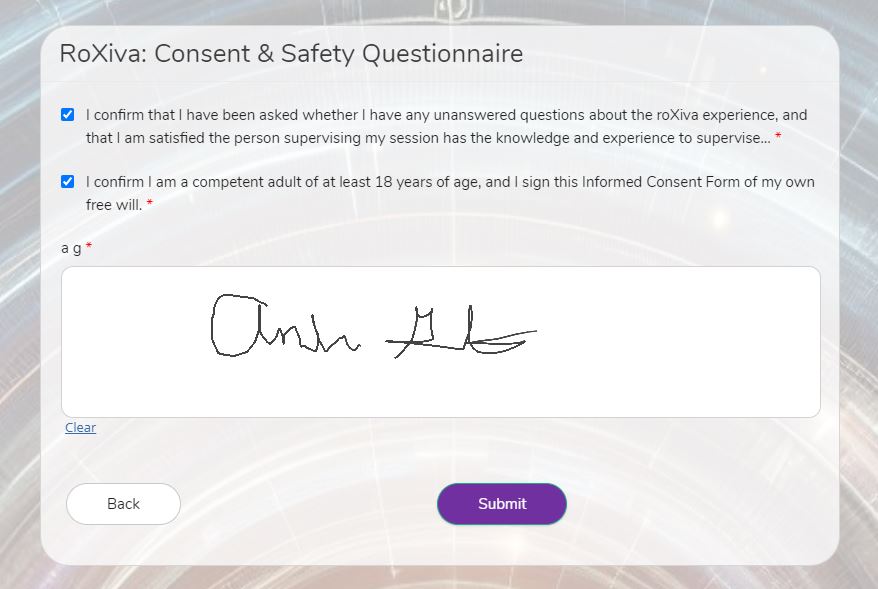The RoXiva RX-1 is a powerful tool to expand and alter consciousness. The visual effects can surprise even experienced people. And so, with a few safety questions taken care of, you will be ready to enjoy your journey. The most important thing for you to remember is that you are always in control of the experience. At any time, you can cover your eyes with a hand or turn away if you experience any discomfort. Don’t push yourself! You can always attempt a session with a different intensity. We recommend being well hydrated before a session.